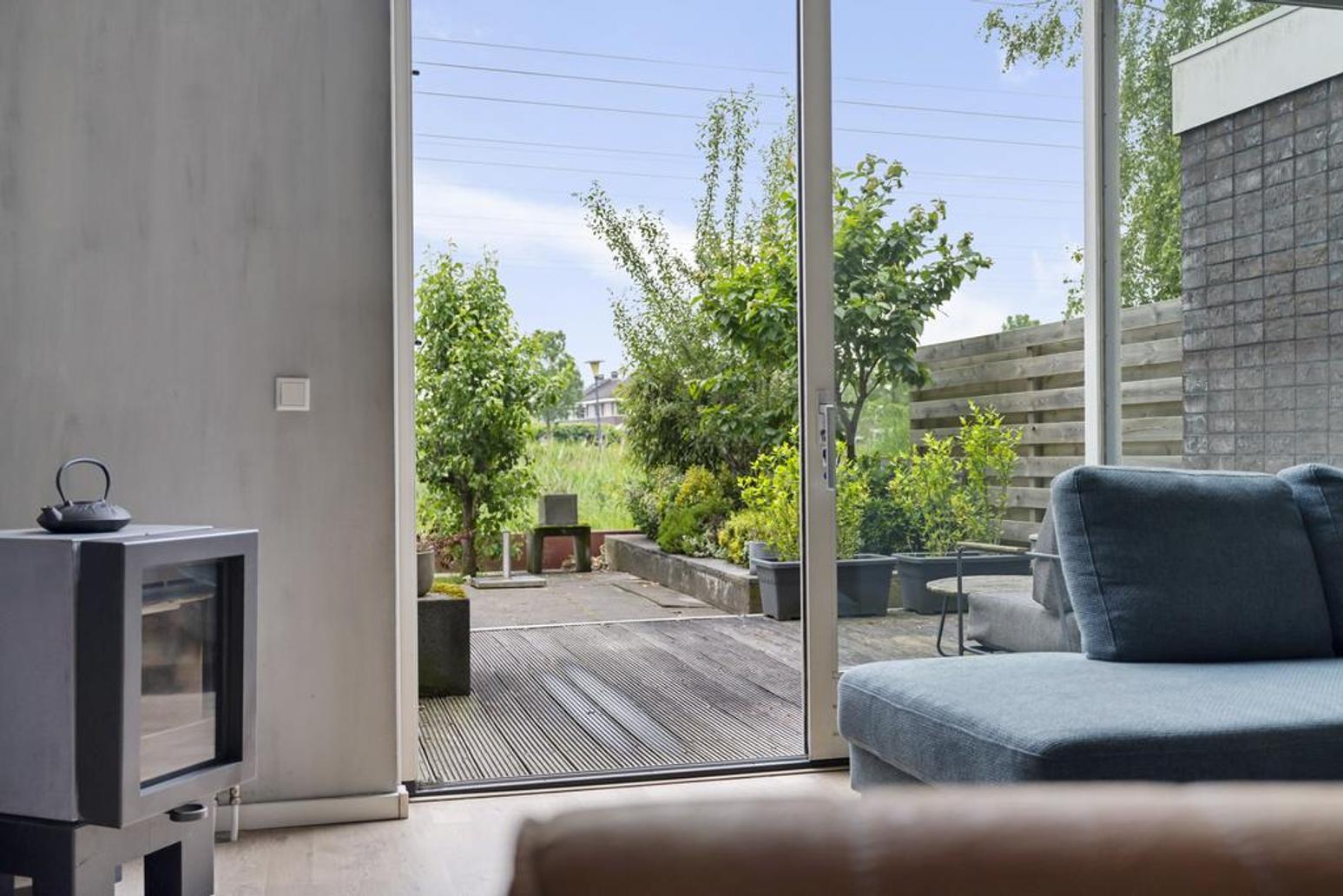 - tuingerichte woonkamer met schuifpui, houtkachel en trapkast