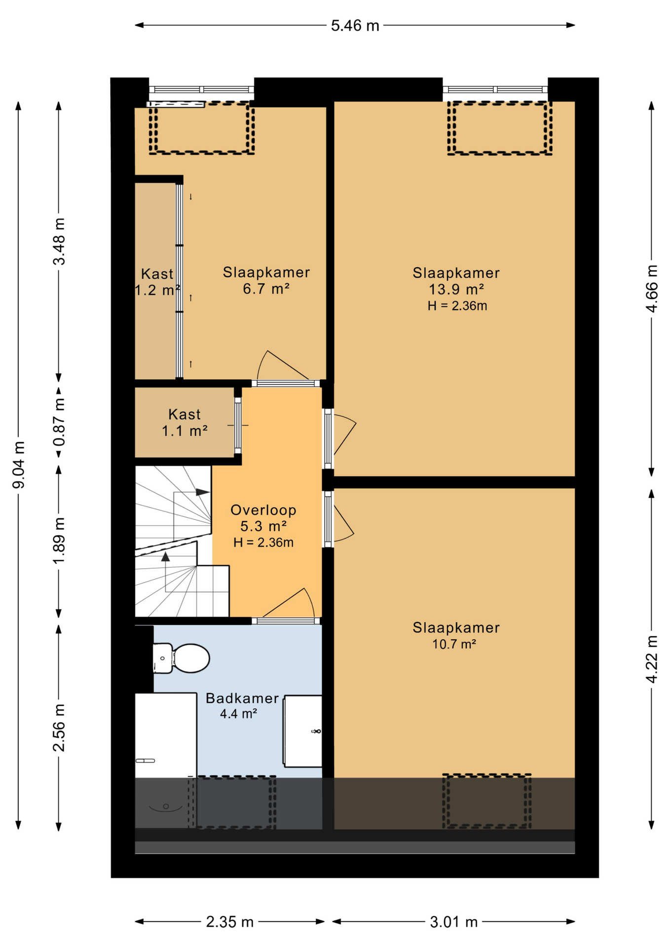 - derde slaapkamer aan achterzijde (6,7 m²)