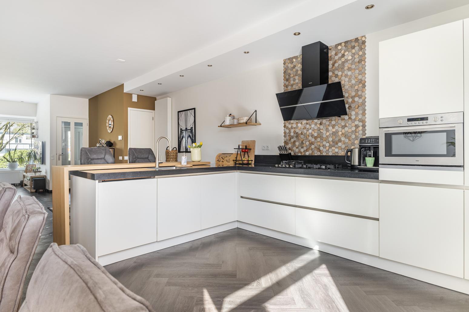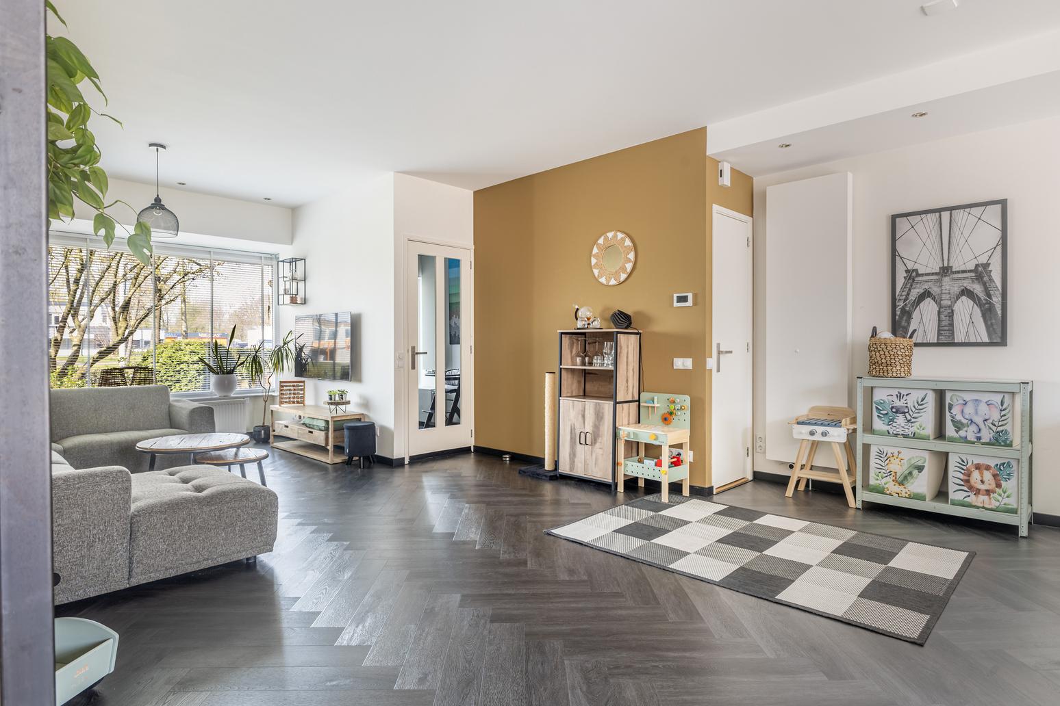 Bij binnenkomst wordt u verwelkomd in een nette hal met ruime garderobe en de trapopgang naar de verdieping. Vanuit hier loopt u door naar de royale en lichte woonkamer van circa 44 m², waar de grote raampartijen zorgen voor een prettige lichtinval en een ruimtelijk gevoel. Aan de voorzijde van de woonkamer bevindt zich een fraaie, brede erker, die niet alleen extra lichtinval biedt maar ook bijdraagt aan de karakteristieke uitstraling van de woning. De strakke afwerking en de stijlvolle visgraatvloer zorgen voor een sfeervol geheel. De moderne open keuken sluit mooi aan op de woonkamer en is uitgevoerd met diverse inbouwapparatuur en volop werk- en bergruimte; een fijne plek voor zowel dagelijks gebruik als gezellig koken met gasten. Aansluitend bevindt zich een tweede hal. Hier is het moderne toilet met fonteintje gesitueerd. Daarnaast treft u hier de witgoedopstelling en een extra ruimte die uitstekend te gebruiken is als kantoor- of studeerkamer. Vanuit deze hal is tevens een loopdeur naar de achtertuin aanwezig.