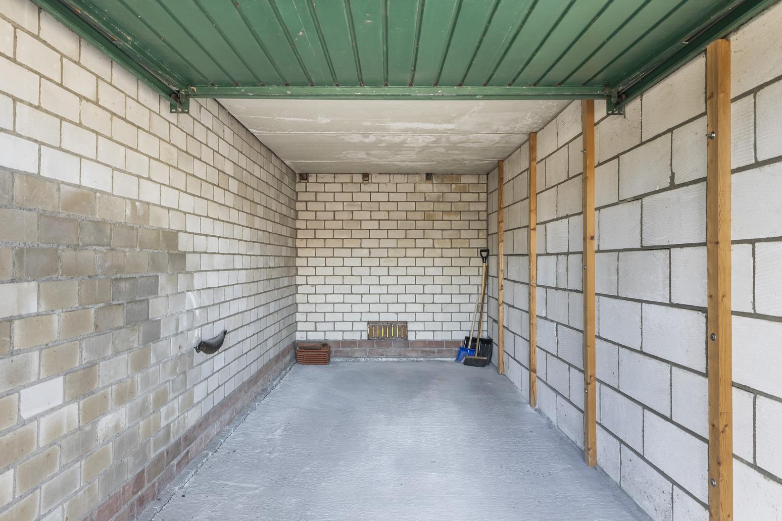De garage heeft een rechthoekige vorm en is bereikbaar via een stalen kanteldeur. De vloer is uitgevoerd in beton en voorzien van een opstand, de wanden zijn opgetrokken uit steen. De garage is niet voorzien van elektra of isolatie, waardoor eventuele verbeteringen naar eigen wens kunnen worden aangebracht. In de garage is een asbesthoudend vezelplaatplafond aanwezig.